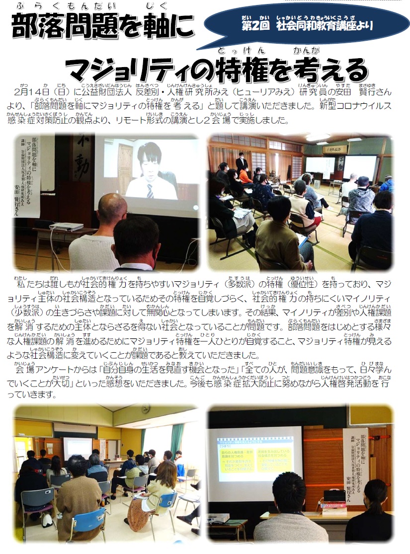 地元自治会をはじめとする団体や人権・同和教育研究組織などとの連携を図り、各種事業に取り組んでいます。