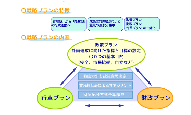平成16年度から平成18年度の3年間、「第1次行政経営戦略プラン」を実施してきました。引き続き、平成19年度からは第2次行政経営戦略プラン(平成19~21年度)を策定し、これに基づいてまちづくりを進めていきます。