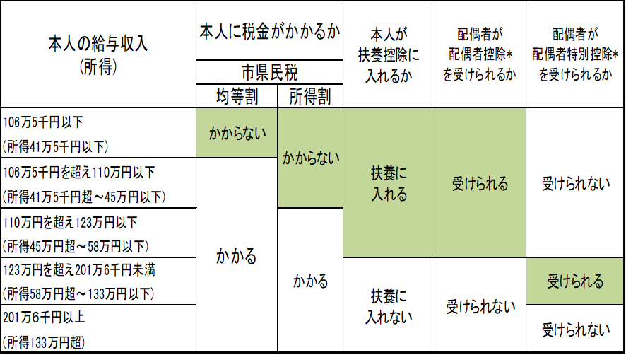 A.パート・アルバイト(給与)の収入金額が106万5千円以下であれば、市・県民税は課税されません。また、123万円を超えると配偶者控除・扶養控除に入ることができません。ただし、配偶者の合計所得金額が1,000万円以下であれば、配偶者特別控除を受けられる場合がありますので、下記の表をご覧ください。