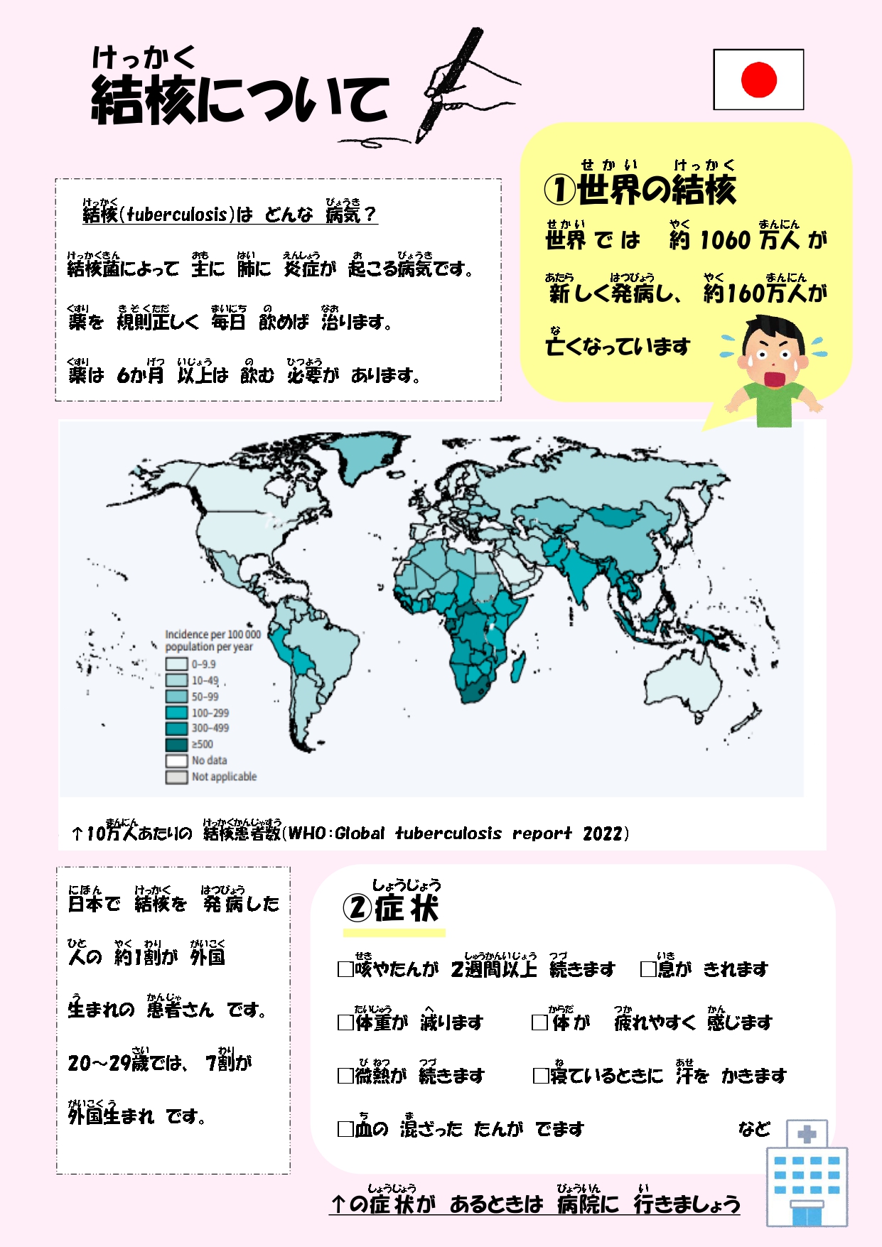 咳や痰が2週間以上続いたら、結核を疑い早めに医師の診察を受けましょう。