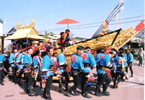 北勢地方に分布する陸上の模擬捕鯨行事である鯨船行事の一つです。 南楠の鯨船が出されるようになったのは明治頃といわれています。 祭礼の中心となるのは南御見束神社で、鯨船は「龍神丸」と呼ばれています。 行事は、鯨船(龍神丸)が張り子の鯨を追いかけ、船上の踊り子が鯨にめがけてモリを放つ勇壮な祭りです。 南楠の鯨船行事は、市内の他の鯨船行事と比べ演技の構成がより整理されて明快になっています。 行事は、昭和37年から保存会が中心となり毎年10月の体育の日の前日と前々日の2日間に行われています。 (『北勢鯨船行事調査報告書』参照。) |
