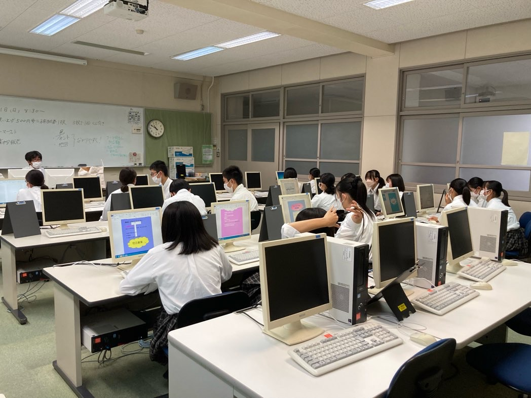 昨年度に引き続き、定期市の一つである「塩浜市場」の活性化に向け課題研究を実施し、消毒液スタンド、のぼり旗、市場紹介ポスター等を作成して塩浜市場や塩浜駅に設置しました。また、12月11日(土)に塩浜市場で生徒による販売会と成果物のお披露目を行いました。