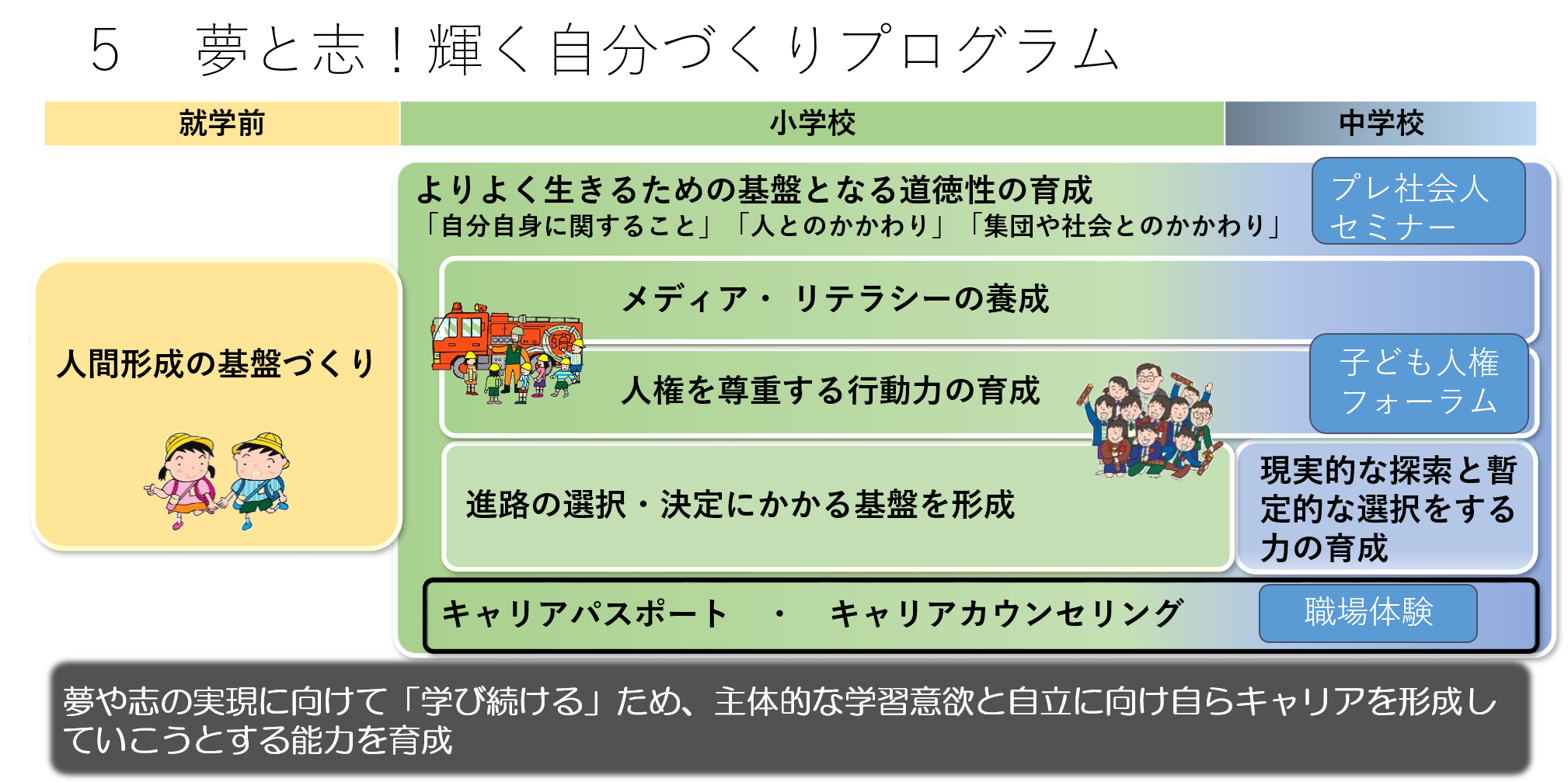 子どもたちが自分の夢や志の実現に向けて「学び続ける」ために、子どもたちに目的意識や社会とのつながりを意識した主体的な学習意欲を持たせること、また社会的・職業的自立に向けた必要な基盤となる資質・能力を育成します。