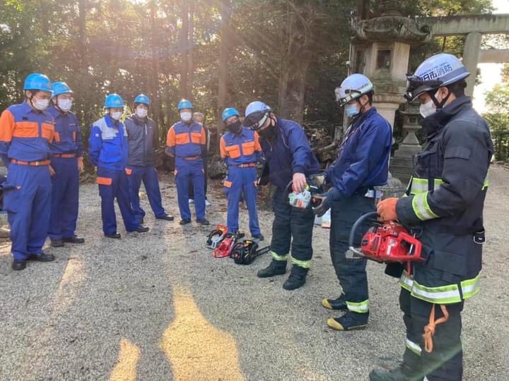 12月12日(日)に、志氐神社におきまして、羽津分団員が、北消防署員の指導のもと、チェーンソーの取り扱い訓練を実施しました。