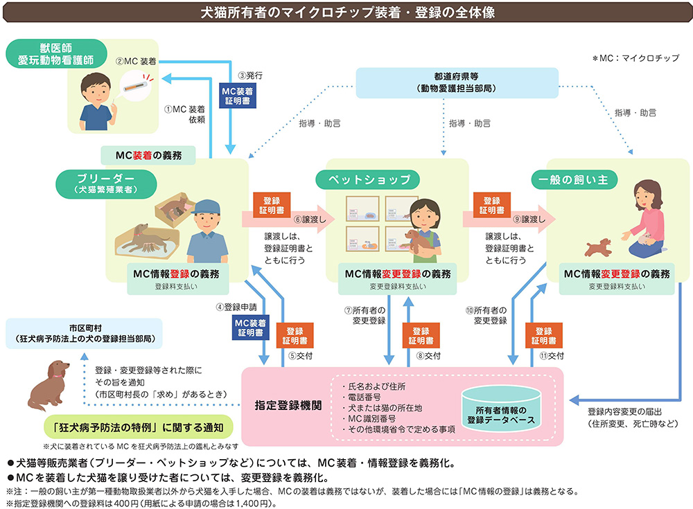また、所有する犬または猫にマイクロチップを装着した者は、その犬猫の飼い主情報やマイクロチップ番号等を指定登録機関(日本獣医師会)に登録することが義務付けられました。