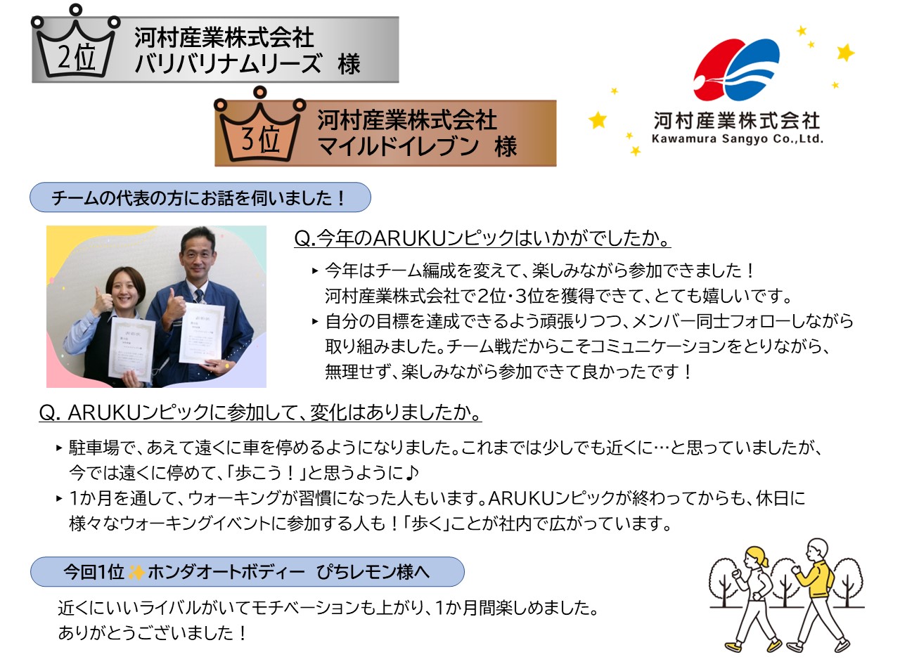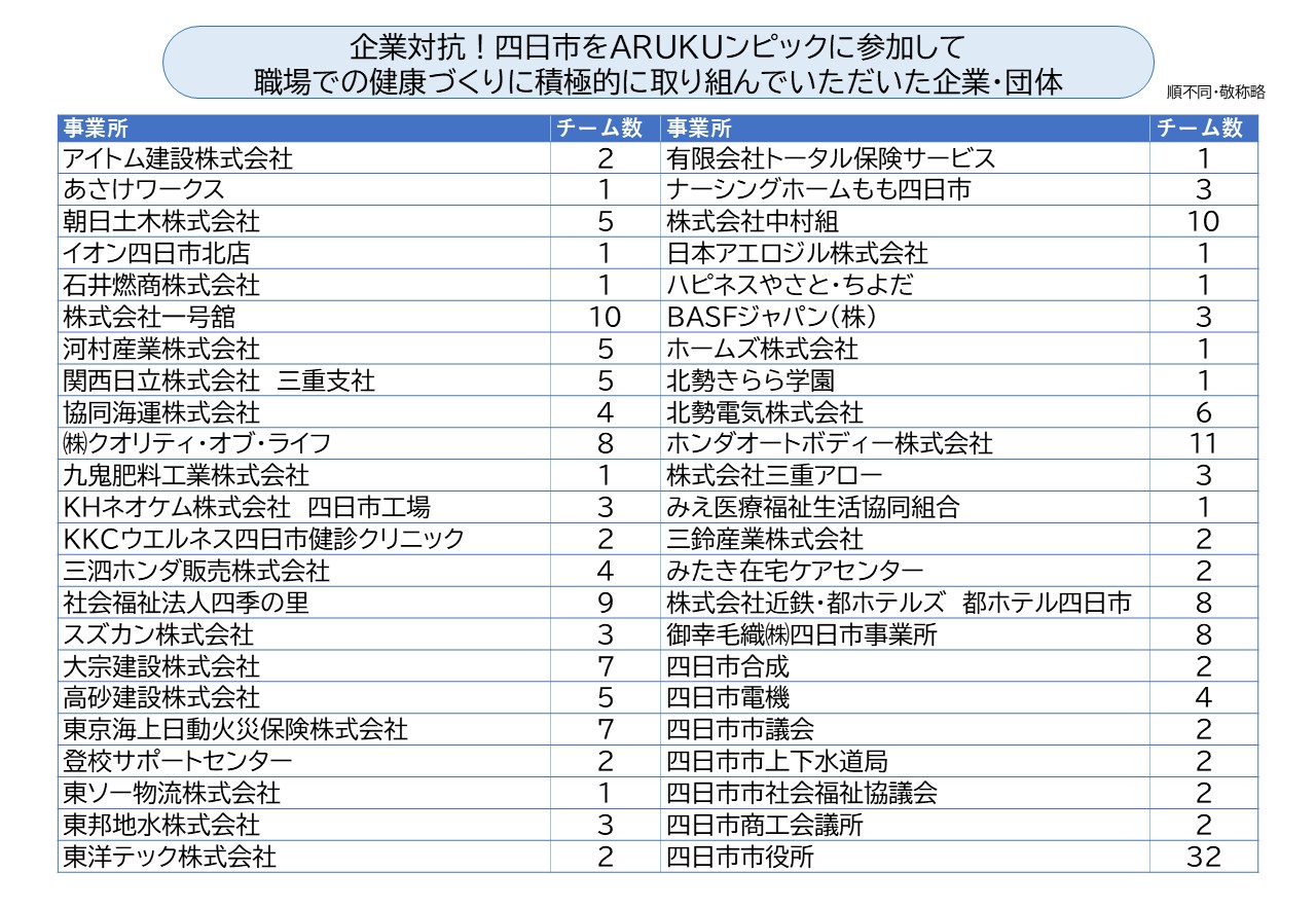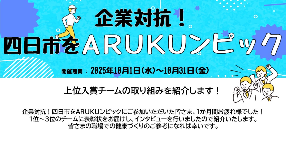 トップ > 市民の方へ > 健康・医療・保健所 > 成人の健康づくり > 健康教室・イベント・四日市市健康マイレージ事業 >令和7年度 企業対抗!四日市をARUKUンピック 入賞チームの取り組みを紹介します!