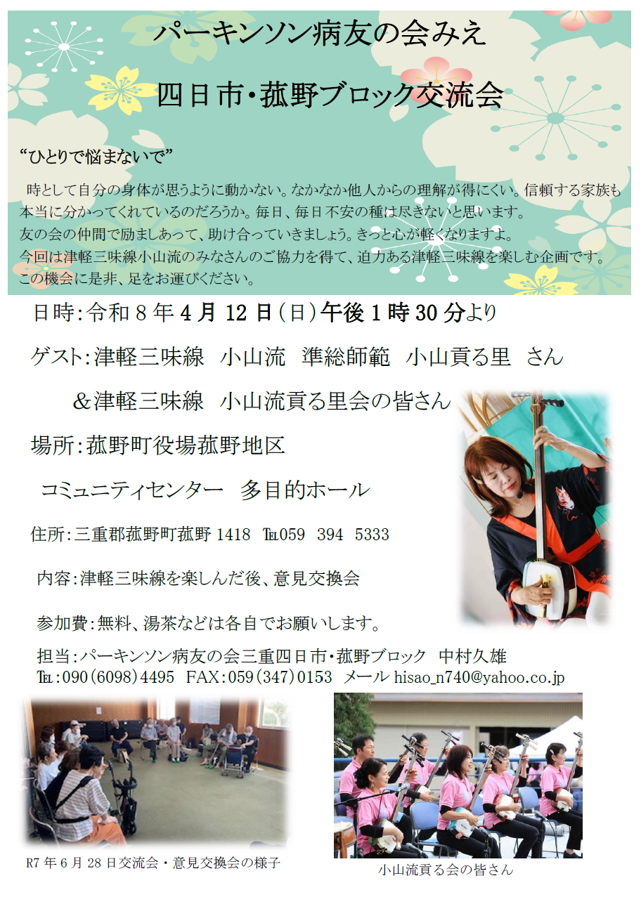 パーキンソン病友の会みえ 四日市・菰野ブロック交流会のお知らせ
