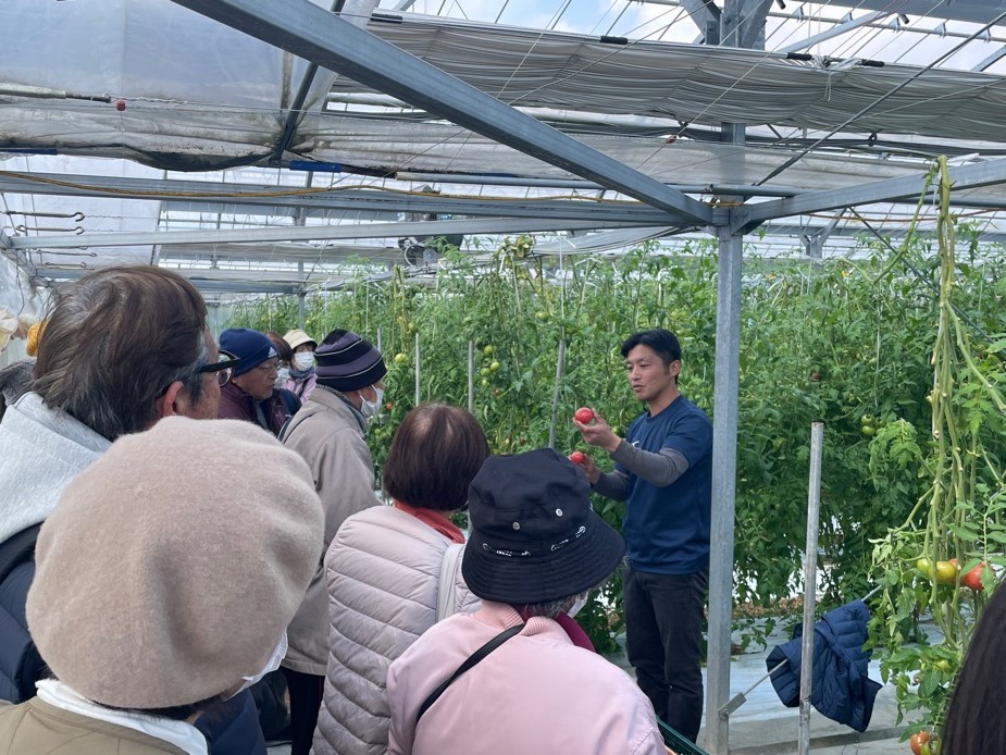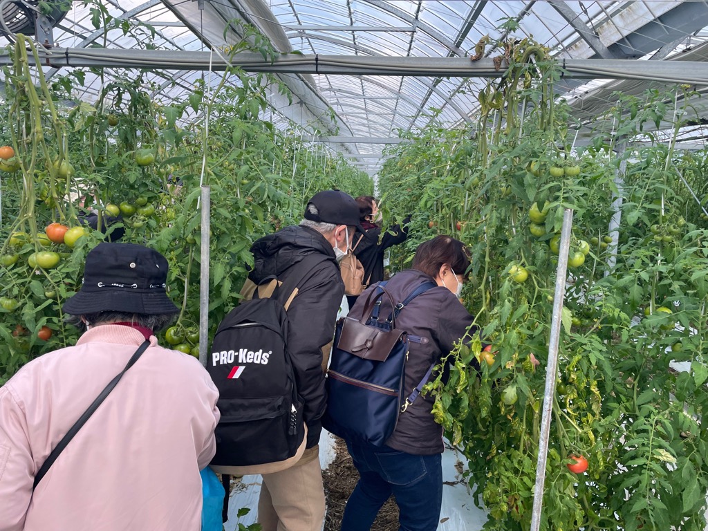 生産者の熱心な説明を受けながら、トマトの収穫体験をしました。参加者の皆様は、普段スーパーで見かけるトマトとは違う、採れたてのトマトの新鮮さに驚かれていました。