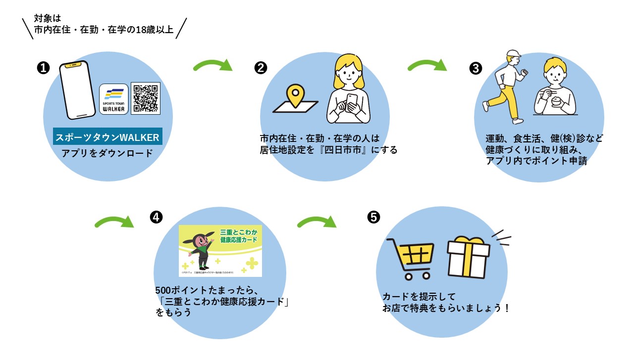 ※市内に在勤、在学する方は、スマートフォンアプリ「スポーツタウンWALKER」内で居住地設定を『四日市市』にする必要があります。