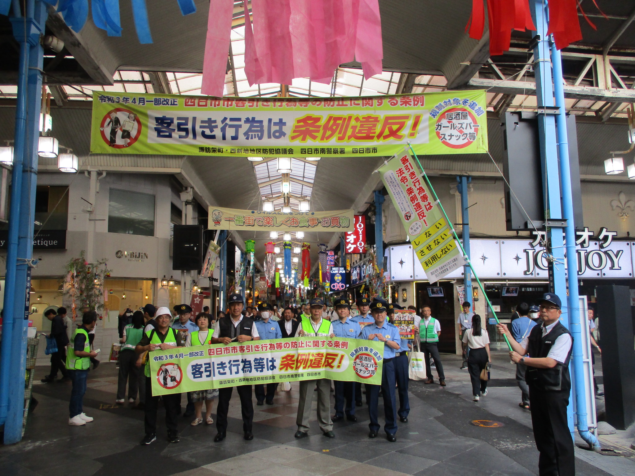 本市では、平成28年7月1日に「四日市市客引き行為等の防止に関する条例」を施行し、公共の場所において市民等に著しく不安を与え、迷惑をかける客引き行為等の防止に努めています。