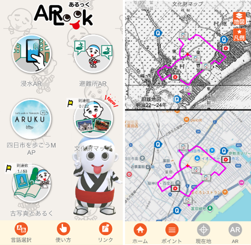 四日市市公式ARアプリ「ARLook(あるっく)」は、浸水ARや避難所ARなどの防災情報と、四日市を歩くためのマップの機能を持ちあわせたアプリです。このたび、四郷地区および富田・富洲原地区*の史跡や神社・寺院、祭礼行事などの文化財について、その歴史や見どころを知ることができる文化財デジタルマップを新たに追加し、本日(令和7年1月14日)より供用を開始します。あわせて、文化財デジタルマップを利用するウォーキングイベントを開催しますので、下記の通りお知らせします。