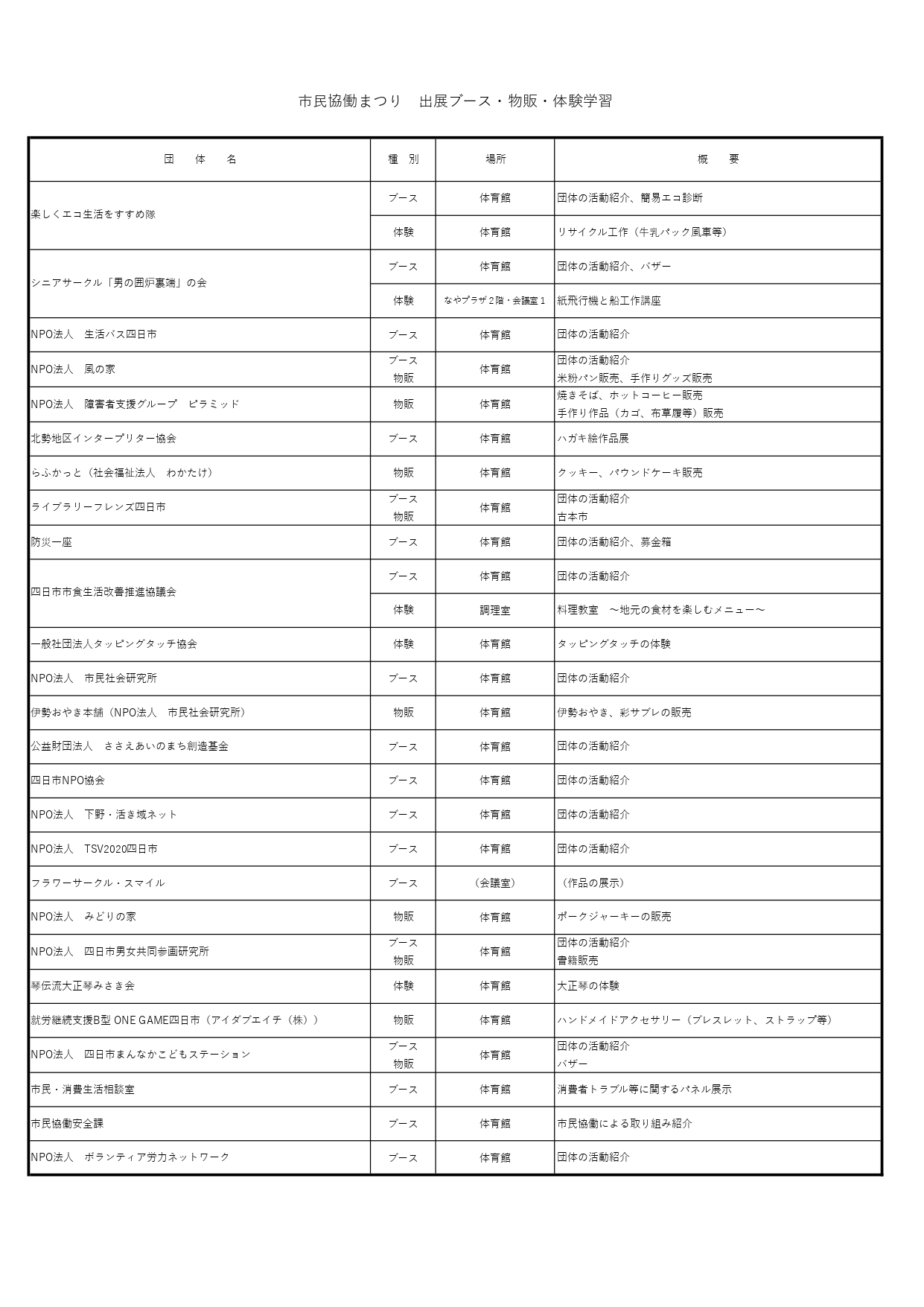 - 出展・展示ブース:子ども、防災、まちづくり、環境、男女共同参画など